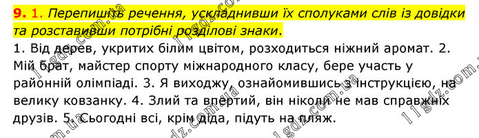 1. Перепишіть речення, ускладнивши їх сполуками слів із довідки та розставивши потрібні розділові знаки. 1. Від дерев, укритих білим цвітом, розходиться ніжний аромат. 2. Мій брат, майстер спорту міжнародного класу, бере участь у районній олімпіаді. 3. Я виходжу, ознайомившись з інструкцією, на велику ковзанку. 4. Злий та впертий, він ніколи не мав справжніх друзів. 5. Сьогодні всі, крім діда, підуть на пляж.