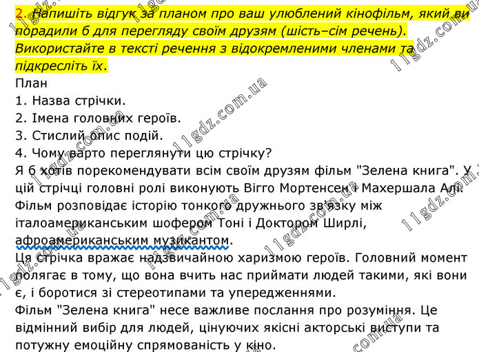 Напишіть відгук за планом про ваш улюблений кінофільм, який ви порадили б для перегляду своїм друзям (шість–сім речень). Використайте в тексті речення з відокремленими членами та підкресліть їх. План 1. Назва стрічки. 2. Імена головних героїв. 3. Стислий опис подій. 4. Чому варто переглянути цю стрічку? Я б хотів порекомендувати всім своїм друзям фільм "Зелена книга". У цій стрічці головні ролі виконують Вігго Мортенсен і Махершала Алі. Фільм розповідає історію тонкого дружнього зв'язку між італоамериканським шофером Тоні і Доктором Ширлі, афроамериканським музикантом. Ця стрічка вражає надзвичайною харизмою героїв. Головний момент полягає в тому, що вона вчить нас приймати людей такими, які вони є, і боротися зі стереотипами та упередженнями. Фільм "Зелена книга" несе важливе послання про розуміння. Це відмінний вибір для людей, цінуючих якісні акторські виступи та потужну емоційну спрямованість у кіно.
