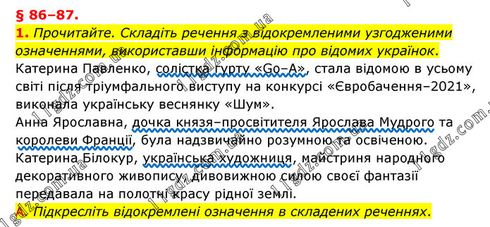 § 86–87. 1. Прочитайте. Складіть речення з відокремленими узгодженими означеннями, використавши інформацію про відомих українок. Катерина Павленко, солістка гурту «Go–A», стала відомою в усьому світі після тріумфального виступу на конкурсі «Євробачення–2021», виконала українську веснянку «Шум». Анна Ярославна, дочка князя–просвітителя Ярослава Мудрого та королеви Франції, була надзвичайно розумною та освіченою. Катерина Білокур, українська художниця, майстриня народного декоративного живопису, дивовижною силою своєї фантазії передавала на полотні красу рідної землі. А. Підкресліть відокремлені означення в складених реченнях.