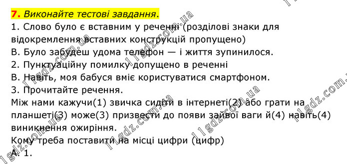 Виконайте тестові завдання. 1. Слово було є вставним у реченні (розділові знаки для відокремлення вставних конструкцій пропущено) В. Було забудеш удома телефон — і життя зупинилося. 2. Пунктуаційну помилку допущено в реченні В. Навіть, моя бабуся вміє користуватися смартфоном. 3. Прочитайте речення. Між нами кажучи(1) звичка сидіти в інтернеті(2) або грати на планшеті(З) може(3) призвести до появи зайвої ваги й(4) навіть(4) виникнення ожиріння. Кому треба поставити на місці цифри (цифр) А. 1.