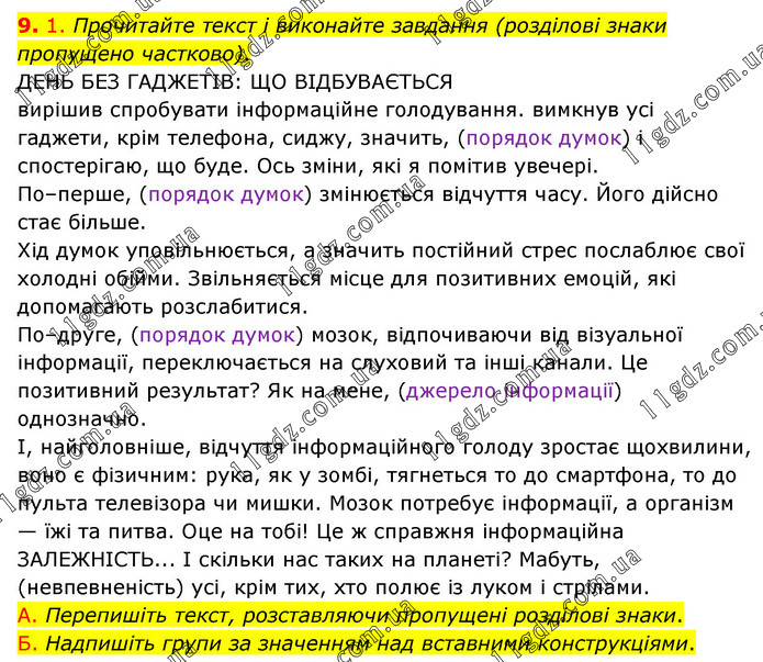 1. Прочитайте текст і виконайте завдання (розділові знаки пропущено частково). ДЕНЬ БЕЗ ГАДЖЕТІВ: ЩО ВІДБУВАЄТЬСЯ вирішив спробувати інформаційне голодування. вимкнув усі гаджети, крім телефона, сиджу, значить, (порядок думок) і спостерігаю, що буде. Ось зміни, які я помітив увечері. По–перше, (порядок думок) змінюється відчуття часу. Його дійсно стає більше. Хід думок уповільнюється, а значить постійний стрес послаблює свої холодні обійми. Звільняється місце для позитивних емоцій, які допомагають розслабитися. По–друге, (порядок думок) мозок, відпочиваючи від візуальної інформації, переключається на слуховий та інші канали. Це позитивний результат? Як на мене, (джерело інформації) однозначно. І, найголовніше, відчуття інформаційного голоду зростає щохвилини, воно є фізичним: рука, як у зомбі, тягнеться то до смартфона, то до пульта телевізора чи мишки. Мозок потребує інформації, а організм — їжі та питва. Оце на тобі! Це ж справжня інформаційна ЗАЛЕЖНІСТЬ... І скільки нас таких на планеті? Мабуть, (невпевненість) усі, крім тих, хто полює із луком і стрілами. А. Перепишіть текст, розставляючи пропущені розділові знаки. Б. Надпишіть групи за значенням над вставними конструкціями.
