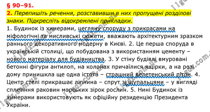 § 90–91. 2. Перепишіть речення, розставивши в них пропущені розділові знаки. Підкресліть відокремлені прикладки. 1. Будинок із химерами, цегляну споруду з прикрасами на міфологічні та мисливські сюжети, вважають архітектурним зразком раннього декоративного модерну в Києві. 2. Це перша споруда в українській столиці, що побудована з використанням цементу – нового матеріалу для будівництва. 3. У стіну будівлі вмуровані бетонні фігури антилоп, на колонах причаїлися ящірки, а на розі дому принишкла ще одна істота – страшний велетенський пітон. 4. Центр стелі прикрашає ліпнина – спрут зі щупальцями – у вигляді сплетіння раковин морських зірок рослин. 5. Нині Будинок із химерами використовують як офіційну резиденцію Президента України.