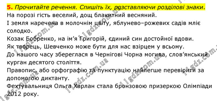 Прочитайте речення. Спишіть їх, розставляючи розділові знаки. На порозі гість веселий, дощ блакитний весняний. І земля наречена в молочнім цвіту, яблунево–рожевих садів мліє солодко. Козак Бобренко, на ім’я Григорій, єдиний син достойної вдови. Як творець, Шевченко може бути для нас взірцем у всьому. До нашого часу збереглася в Чернігові Чорна могила, слов’янський курган десятого століття. Правопис, або орфографію та пунктуацію найлегше перевірити за допомогою диктанту. Фехтувальниця Ольга Харлан стала бронзовою призеркою Олімпіади 2012 року.