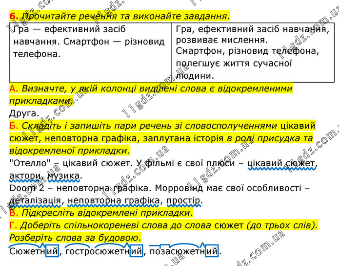 Прочитайте речення та виконайте завдання. Гра — ефективний засіб навчання. Смартфон — різновид телефона. Гра, ефективний засіб навчання, розвиває мислення. Смартфон, різновид телефона, полегшує життя сучасної людини. А. Визначте, у якій колонці виділені слова є відокремленими прикладками. Друга. Б. Складіть і запишіть пари речень зі словосполученнями цікавий сюжет, неповторна графіка, заплутана історія в ролі присудка та відокремленої прикладки. "Отелло" – цікавий сюжет. У фільмі є свої плюси – цікавий сюжет, актори, музика. Doom 2 – неповторна графіка. Морровінд має свої особливості – деталізація, неповторна графіка, простір. В. Підкресліть відокремлені прикладки. Г. Доберіть спільнокореневі слова до слова сюжет (до трьох слів). Розберіть слова за будовою. Сюжетний, гостросюжетний, позасюжетний.