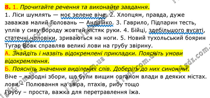 1. Прочитайте речення та виконайте завдання. 1. Ліси шумлять — моє зелене віче. 2. Хлопцям, правда, дуже заважав малий Головань — Андрійко. 3. Гаврило, Підпарин тесть, уплів у сиву бороду жовтий кістяк руки. 4. Бійці, здебільшого вусаті, статечні чоловіки, зриваються на ноги. 5. Новий тухольський боярин Тугар Вовк справляв великі лови на грубу звірину. А. Знайдіть і назвіть відокремлені прикладки. Поясніть умови відокремлення. Б. Поясніть значення виділених слів. Доберіть до них синоніми. Віче – народні збори, що були вищим органом влади в деяких містах. лови – Полювання на звіра, птахів, рибу тощо Грубу – проста, важка для перетравлення їжа.