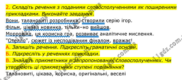 Складіть речення з поданими словосполученнями як поширеними прикладками. Виконайте завдання. Вони, талановиті розробники, створили серію ігор. Фільм, цікава новинка, тільки–но вийшов. Морровінд, ця корисна гра, розвиває аналітичне мислення. "Отелло", сюжет із несподіваним фіналом, вражає! A. Запишіть речення. Підкресліть граматичні основи. Б. Підкресліть у реченнях прикладки. B. Знайдіть прикметники в запропонованих словосполученнях. Чи утворюють ці прикметники ступені порівняння? Талановиті, цікава, корисна, оригінальні, веселі