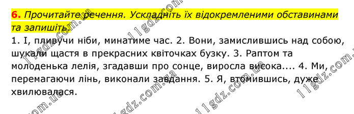 Прочитайте речення. Ускладніть їх відокремленими обставинами та запишіть. 1. І, пливучи ніби, минатиме час. 2. Вони, замислившись над собою, шукали щастя в прекрасних квіточках бузку. 3. Раптом та молоденька лелія, згадавши про сонце, виросла висока.... 4. Ми, перемагаючи лінь, виконали завдання. 5. Я, втомившись, дуже хвилювалася.