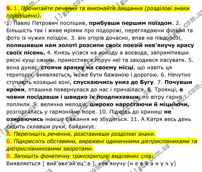 1. Прочитайте речення та виконайте завдання (розділові знаки пропущено). 1. Павло Петрович поспішив, прибувши першим поїздом. 2. Більшість так і живе мріями про подорожі, переглядаючи фільми та фото із чужих поїздок. 3. він згорів дочасно, впав на півдорозі, полишивши нам золоті розсипи своїх поезій нев’янучу красу своїх пісень. 4. Князь усівся на колоду а воєвода, запримітивши рясні кущі ожини, примостився поруч неї та заходився ласувати. 5. вона думає, стоячи зранку на своєму місці, що навіть ця територія, виявляється, може бути бажаною і дорогою. 6. Нечутно ступають козацькі коні, спускаючись униз до Бугу. 7. Почувши кроки, пташина повернулася до нас і причаїлася. 8. Троянці, в човни посідавши і швидко їх поодпихавши, по вітру гарно поплили. 9. велична мелодія, широко наростаючи й міцніючи, розгорталась у гармонійне море. 10. Підходь до криниці не озираючись інакше бажання не збудеться. 11. А Катря весь день сидить склавши руки, байдикує. A. Перепишіть речення, розставивши розділові знаки. Б. Підкресліть обставини, виражені одиничними дієприслівниками та дієприслівниковими зворотами. B. Запишіть фонетичну транскрипцію виділених слів. Виявляється [ вий’авл’ай’ец’:а ], нев’янучу [н е в й а н у ч у]