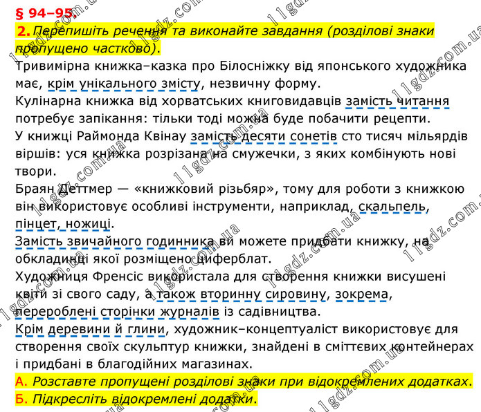 § 94–95. 2. Перепишіть речення та виконайте завдання (розділові знаки пропущено частково). Тривимірна книжка–казка про Білосніжку від японського художника має, крім унікального змісту, незвичну форму. Кулінарна книжка від хорватських книговидавців замість читання потребує запікання: тільки тоді можна буде побачити рецепти. У книжці Раймонда Квінау замість десяти сонетів сто тисяч мільярдів віршів: уся книжка розрізана на смужечки, з яких комбінують нові твори. Браян Деттмер — «книжковий різьбяр», тому для роботи з книжкою він використовує особливі інструменти, наприклад, скальпель, пінцет, ножиці. Замість звичайного годинника ви можете придбати книжку, на обкладинці якої розміщено циферблат. Художниця Френсіс використала для створення книжки висушені квіти зі свого саду, а також вторинну сировину, зокрема, перероблені сторінки журналів із садівництва. Крім деревини й глини, художник–концептуаліст використовує для створення своїх скульптур книжки, знайдені в сміттєвих контейнерах і придбані в благодійних магазинах. A. Розставте пропущені розділові знаки при відокремлених додатках. Б. Підкресліть відокремлені додатки.