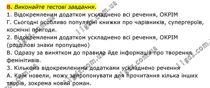 Виконайте тестові завдання. 1. Відокремленим додатком ускладнено всі речення, ОКРІМ Г. Сьогодні особливо популярні книжки про чарівників, супергероїв, космічні пригоди. 2. Відокремленим додатком ускладнено всі речення, ОКРІМ (розділові знаки пропущено) В. Одразу за винятком до правила йде інформація про творення фемінітивів. 3. Кількома відокремленими додатками ускладнено речення А. Крім новели, можу запропонувати для прочитання кілька інших творів, зокрема новий роман.