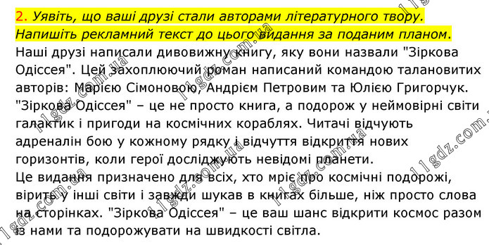 Уявіть, що ваші друзі стали авторами літературного твору. Напишіть рекламний текст до цього видання за поданим планом. Наші друзі написали дивовижну книгу, яку вони назвали "Зіркова Одіссея". Цей захоплюючий роман написаний командою талановитих авторів: Марією Сімоновою, Андрієм Петровим та Юлією Григорчук. "Зіркова Одіссея" – це не просто книга, а подорож у неймовірні світи галактик і пригоди на космічних кораблях. Читачі відчують адреналін бою у кожному рядку і відчуття відкриття нових горизонтів, коли герої досліджують невідомі планети. Це видання призначено для всіх, хто мріє про космічні подорожі, вірить у інші світи і завжди шукав в книгах більше, ніж просто слова на сторінках. "Зіркова Одіссея" – це ваш шанс відкрити космос разом із нами та подорожувати на швидкості світла.