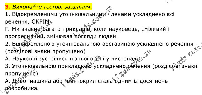 Виконайте тестові завдання. 1. Відокремленими уточнювальними членами ускладнено всі речення, ОКРІМ Г. Ми знаємо багато прикладів, коли науковець, сміливий і прогресивний, змінював погляди людей. 2. Відокремленою уточнювальною обставиною ускладнено речення (розділові знаки пропущено) А. Науковці зустрілися пізньої осені у листопаді. 3. Уточнювальною прикладкою ускладнено речення (розділові знаки пропущено) А. Диво–машина або гвинтокрил стала одним із досягнень розробника.
