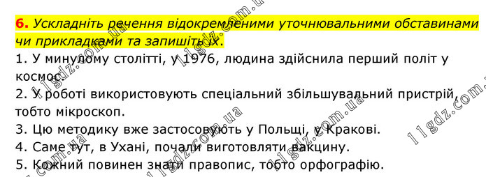 Ускладніть речення відокремленими уточнювальними обставинами чи прикладками та запишіть їх. 1. У минулому столітті, у 1976, людина здійснила перший політ у космос. 2. У роботі використовують спеціальний збільшувальний пристрій, тобто мікроскоп. 3. Цю методику вже застосовують у Польщі, у Кракові. 4. Саме тут, в Ухані, почали виготовляти вакцину. 5. Кожний повинен знати правопис, тобто орфографію.