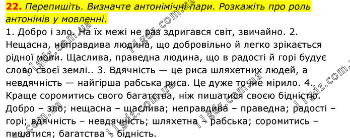 Перепишіть. Визначте антонімічні пари. Розкажіть про роль антонімів у мовленні. 1. Добро і зло. На їх межі не раз здригався світ, звичайно. 2. Нещасна, неправдива людина, що добровільно й легко зрікається рідної мови. Щаслива, праведна людина, що в радості й горі будує слово своєї землі.. 3. Вдячність — це риса шляхетних людей, а невдячність — найгірша рабська риса. Це дуже точне мірило. 4. Краще соромитись свого багатства, ніж пишатися своєю бідністю. Добро – зло; нещасна – щаслива; неправдива – праведна; радості – горі; вдячність – невдячність; шляхетна – рабська; соромитись – пишатися; багатства – бідність.