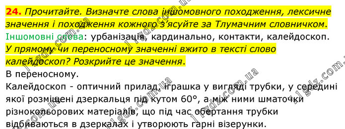 Прочитайте. Визначте слова іншомовного походження, лексичне значення і походження кожного з’ясуйте за Тлумачним словничком. Іншомовні слова: урбанізація, кардинально, контакти, калейдоскоп. У прямому чи переносному значенні вжито в тексті слово калейдоскоп? Розкрийте це значення. В переносному. Калейдоскоп - оптичний прилад, іграшка у вигляді трубки, у середині якої розміщені дзеркальця під кутом 60°, а між ними шматочки різнокольорових матеріалів, що під час обертання трубки відбиваються в дзеркалах і утворюють гарні візерунки.