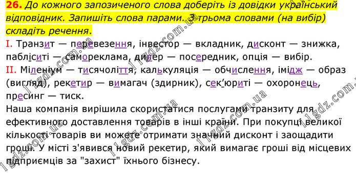 До кожного запозиченого слова доберіть із довідки український відповідник. Запишіть слова парами. З трьома словами (на вибір) складіть речення. І. Транзит — перевезення, інвестор — вкладник, дисконт — знижка, пабліситі — самореклама, дилер — посередник, опція — вибір. II. Міленіум — тисячоліття, калькуляція — обчислення, імідж — образ (вигляд), рекетир — вимагач (здирник), сек’юриті — охоронець, пресинг — тиск. Наша компанія вирішила скористатися послугами транзиту для ефективного доставлення товарів в інші країни. При покупці великої кількості товарів ви можете отримати значний дисконт і заощадити гроші. У місті з'явився новий рекетир, який вимагає гроші від місцевих підприємців за "захист" їхнього бізнесу.