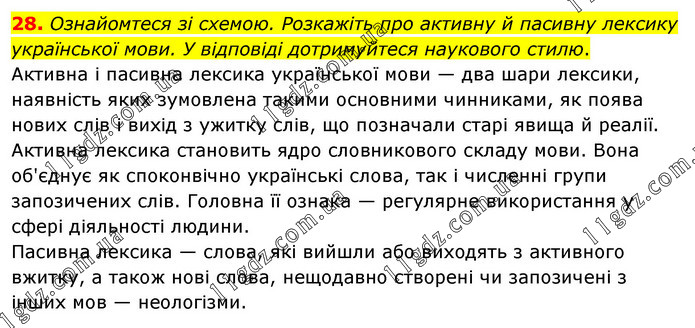 Ознайомтеся зі схемою. Розкажіть про активну й пасивну лексику української мови. У відповіді дотримуйтеся наукового стилю. Активна і пасивна лексика української мови — два шари лексики, наявність яких зумовлена такими основними чинниками, як поява нових слів і вихід з ужитку слів, що позначали старі явища й реалії. Активна лексика становить ядро словникового складу мови. Вона об'єднує як споконвічно українські слова, так і численні групи запозичених слів. Головна її ознака — регулярне використання у сфері діяльності людини. Пасивна лексика — слова, які вийшли або виходять з активного вжитку, а також нові слова, нещодавно створені чи запозичені з інших мов — неологізми.