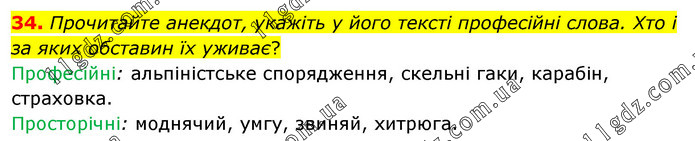 Прочитайте анекдот, укажіть у його тексті професійні слова. Хто і за яких обставин їх уживає? Професійні: альпіністське спорядження, скельні гаки, карабін, страховка. Просторічні: моднячий, умгу, звиняй, хитрюга.