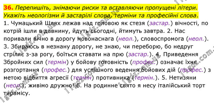 Перепишіть, знімаючи риски та вставляючи пропущені літери. Укажіть неологізми й застарілі слова, терміни та професійні слова. 1. Чумацький Шлях лежав над головою як стезя (застар.) вічності, по котрій ішли в давнину, йдуть сьогодні, йтимуть завтра. 2. Нас поривали вічно в дорогу мовонаснага (неол.), словоспромога (неол.). 3. Збираюсь в незнану дорогу, не знаю, чи переборю, бо недруг стріляє з-за рогу, боїться ставати на прю (застар.). 4. Приведення Збройних сил (термін) у бойову готовність (профес.) означає їхнє розгортання (профес.) для успішного ведення бойових дій (профес.) з метою відбиття агресії (термін) противника (термін.). 5. Нетизяни (неол.), живімо дружно! 6. На родинне свято я несу італійський торт тирамісу.