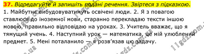 Відредагуйте й запишіть подані речення. Звіртеся з підказкою. 1. Майбутнє вибудовуватимуть освічені люди. 2. Я з повагою ставлюся до іноземної мови, старанно перекладаю тексти іншою мовою, правильно відповідаю на уроках. 3. Учитель вважає, що я тямущий учень. 4. Наступний урок — математика, це мій улюблений предмет. 5. Мені поталанило — я розв’язав цю задачу.