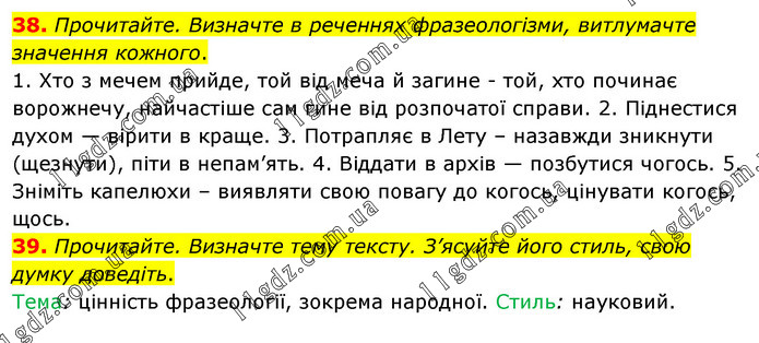 38. Прочитайте. Визначте в реченнях фразеологізми, витлумачте значення кожного. 1. Хто з мечем прийде, той від меча й загине - той, хто починає ворожнечу, найчастіше сам гине від розпочатої справи. 2. Піднестися духом — вірити в краще. 3. Потрапляє в Лету – назавжди зникнути (щезнути), піти в непам’ять. 4. Віддати в архів — позбутися чогось. 5. Зніміть капелюхи – виявляти свою повагу до когось, цінувати когось, щось. 39. Прочитайте. Визначте тему тексту. З’ясуйте його стиль, свою думку доведіть. Тема: цінність фразеології, зокрема народної. Стиль: науковий.