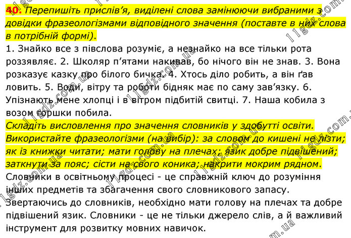 Перепишіть прислів’я, виділені слова замінюючи вибраними з довідки фразеологізмами відповідного значення (поставте в них слова в потрібній формі). 1. Знайко все з півслова розуміє, а незнайко на все тільки рота роззявляє. 2. Школяр п’ятами накивав, бо нічого він не знав. 3. Вона розказує казку про білого бичка. 4. Хтось діло робить, а він ґав ловить. 5. Води, вітру та роботи бідняк має по саму зав’язку. 6. Упізнають мене хлопці і в вітром підбитій свитці. 7. Наша кобила з возом горшки побила. Складіть висловлення про значення словників у здобутті освіти. Використайте фразеологізми (на вибір): за словом до кишені не лізти; як із книжки читати; мати голову на плечах; язик добре підвішений; заткнути за пояс; сісти на свого коника; накрити мокрим рядном. Словники в освітньому процесі - це справжній ключ до розуміння інших предметів та збагачення свого словникового запасу. Звертаючись до словників, необхідно мати голову на плечах та добре підвішений язик. Словники - це не тільки джерело слів, а й важливий інструмент для розвитку мовних навичок.