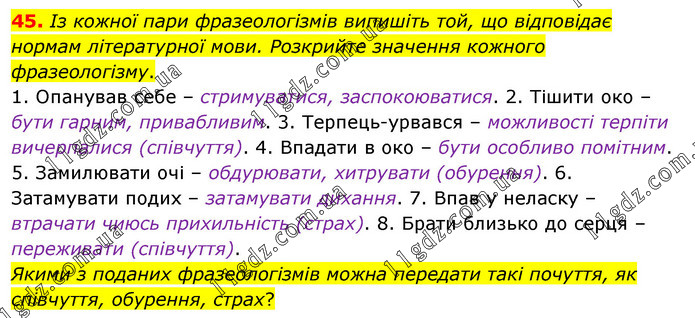 Із кожної пари фразеологізмів випишіть той, що відповідає нормам літературної мови. Розкрийте значення кожного фразеологізму. 1. Опанував себе – стримуватися, заспокоюватися. 2. Тішити око – бути гарним, привабливим. 3. Терпець-урвався – можливості терпіти вичерпалися (співчуття). 4. Впадати в око – бути особливо помітним. 5. Замилювати очі – обдурювати, хитрувати (обурення). 6. Затамувати подих – затамувати дихання. 7. Впав у неласку – втрачати чиюсь прихильність (страх). 8. Брати близько до серця – переживати (співчуття). Якими з поданих фразеологізмів можна передати такі почуття, як співчуття, обурення, страх?