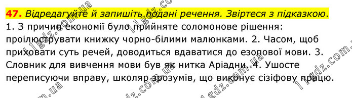 Відредагуйте й запишіть подані речення. Звіртеся з підказкою. 1. З причин економії було прийняте соломонове рішення: проілюструвати книжку чорно-білими малюнками. 2. Часом, щоб приховати суть речей, доводиться вдаватися до езопової мови. 3. Словник для вивчення мови був як нитка Аріадни. 4. Ушосте переписуючи вправу, школяр зрозумів, що виконує сізіфову працю.