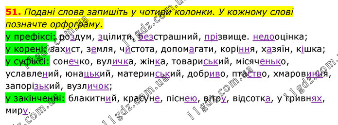Подані слова запишіть у чотири колонки. У кожному слові позначте орфограму. у префіксі: роздум, зцілити, безстрашний, прізвище. недооцінка; у корені: захист, земля, чистота, допомагати, коріння, хазяїн, кішка; у суфіксі: сонечко, вуличка, жінка, товариський, місяченько, уславлений, юнацький, материнський, добриво, птаство, хмаровиння, запорізький, вузличок; у закінченні: блакитний, красуне, піснею, вітру, відсотка, у гривнях, миру.
