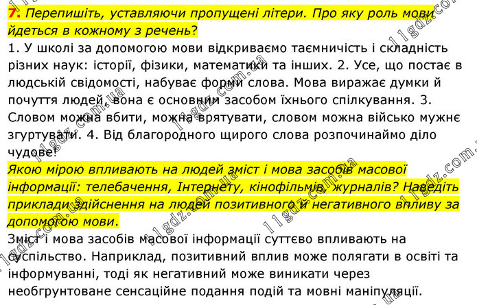 Перепишіть, уставляючи пропущені літери. Про яку роль мови йдеться в кожному з речень? 1. У школі за допомогою мови відкриваємо таємничість і складність різних наук: історії, фізики, математики та інших. 2. Усе, що постає в людській свідомості, набуває форми слова. Мова виражає думки й почуття людей, вона є основним засобом їхнього спілкування. 3. Словом можна вбити, можна врятувати, словом можна військо мужнє згуртувати. 4. Від благородного щирого слова розпочинаймо діло чудове! Якою мірою впливають на людей зміст і мова засобів масової інформації: телебачення, Інтернету, кінофільмів, журналів? Наведіть приклади здійснення на людей позитивного й негативного впливу за допомогою мови. Зміст і мова засобів масової інформації суттєво впливають на суспільство. Наприклад, позитивний вплив може полягати в освіті та інформуванні, тоді як негативний може виникати через необгрунтоване сенсаційне подання подій та мовні маніпуляції.
