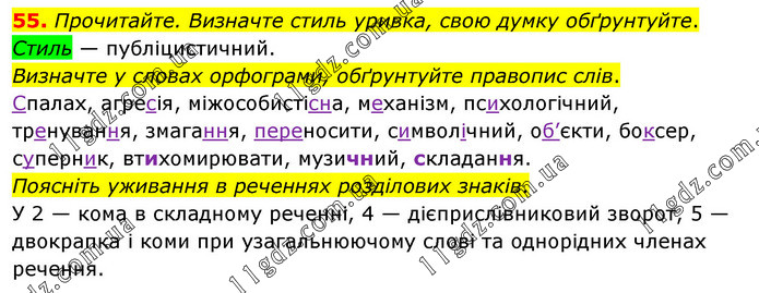 Прочитайте. Визначте стиль уривка, свою думку обґрунтуйте. Стиль — публіцистичний. Визначте у словах орфограми, обґрунтуйте правопис слів. Спалах, агресія, міжособистісна, механізм, психологічний, тренування, змагання, переносити, символічний, об’єкти, боксер, суперник, втихомирювати, музичний, складання. Поясніть уживання в реченнях розділових знаків. У 2 — кома в складному реченні, 4 — дієприслівниковий зворот, 5 — двокрапка і коми при узагальнюючому слові та однорідних членах речення.