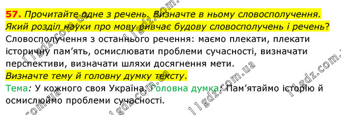 Прочитайте одне з речень. Визначте в ньому словосполучення. Який розділ науки про мову вивчає будову словосполучень і речень? Словосполучення з останнього речення: маємо плекати, плекати історичну пам’ять, осмислювати проблеми сучасності, визначати перспективи, визначати шляхи досягнення мети. Визначте тему й головну думку тексту. Тема: У кожного своя Україна. Головна думка: Пам’ятаймо історію й осмислюймо проблеми сучасності.