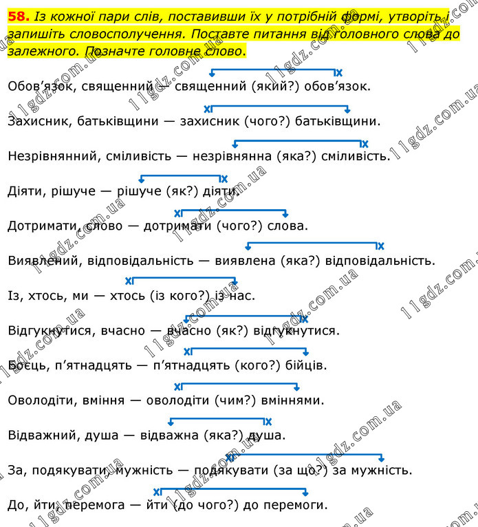 Із кожної пари слів, поставивши їх у потрібній формі, утворіть і запишіть словосполучення. Поставте питання від головного слова до залежного. Позначте головне слово. Обов’язок, священний — священний (який?) обов’язок. Захисник, батьківщини — захисник (чого?) батьківщини. Незрівнянний, сміливість — незрівнянна (яка?) сміливість. Діяти, рішуче — рішуче (як?) діяти. Дотримати, слово — дотримати (чого?) слова. Виявлений, відповідальність — виявлена (яка?) відповідальність. Із, хтось, ми — хтось (із кого?) із нас. Відгукнутися, вчасно — вчасно (як?) відгукнутися. Боєць, п’ятнадцять — п’ятнадцять (кого?) бійців. Оволодіти, вміння — оволодіти (чим?) вміннями. Відважний, душа — відважна (яка?) душа. За, подякувати, мужність — подякувати (за що?) за мужність. До, йти, перемога — йти (до чого?) до перемоги.