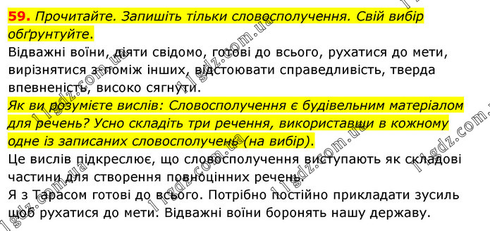 Прочитайте. Запишіть тільки словосполучення. Свій вибір обґрунтуйте. Відважні воїни, діяти свідомо, готові до всього, рухатися до мети, вирізнятися з-поміж інших, відстоювати справедливість, тверда впевненість, високо сягнути. Як ви розумієте вислів: Словосполучення є будівельним матеріалом для речень? Усно складіть три речення, використавши в кожному одне із записаних словосполучень (на вибір). Це вислів підкреслює, що словосполучення виступають як складові частини для створення повноцінних речень. Я з Тарасом готові до всього. Потрібно постійно прикладати зусиль щоб рухатися до мети. Відважні воїни боронять нашу державу.