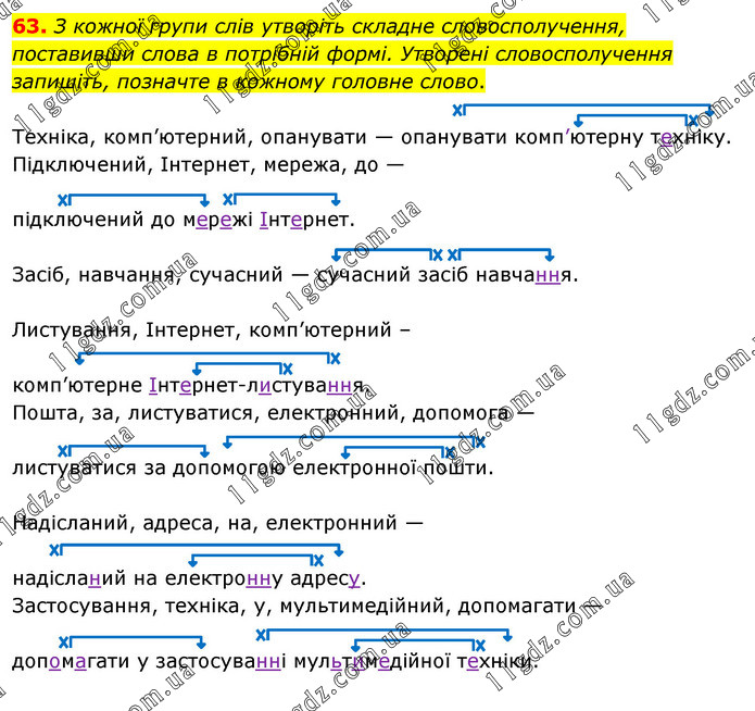 З кожної групи слів утворіть складне словосполучення, поставивши слова в потрібній формі. Утворені словосполучення запишіть, позначте в кожному головне слово. Техніка, комп’ютерний, опанувати — опанувати комп’ютерну техніку. Підключений, Інтернет, мережа, до — підключений до мережі Інтернет. Засіб, навчання, сучасний — сучасний засіб навчання. Листування, Інтернет, комп’ютерний – комп’ютерне Інтернет-листування. Пошта, за, листуватися, електронний, допомога — листуватися за допомогою електронної пошти. Надісланий, адреса, на, електронний — надісланий на електронну адресу. Застосування, техніка, у, мультимедійний, допомагати — допомагати у застосуванні мультимедійної техніки.