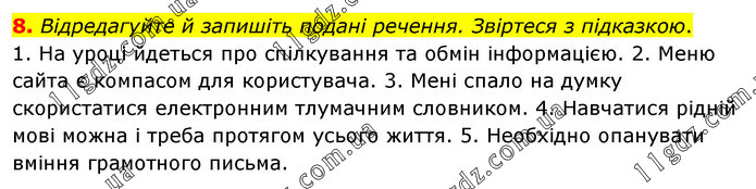 Відредагуйте й запишіть подані речення. Звіртеся з підказкою. 1. На уроці йдеться про спілкування та обмін інформацією. 2. Меню сайта є компасом для користувача. 3. Мені спало на думку скористатися електронним тлумачним словником. 4. Навчатися рідній мові можна і треба протягом усього життя. 5. Необхідно опанувати вміння грамотного письма.