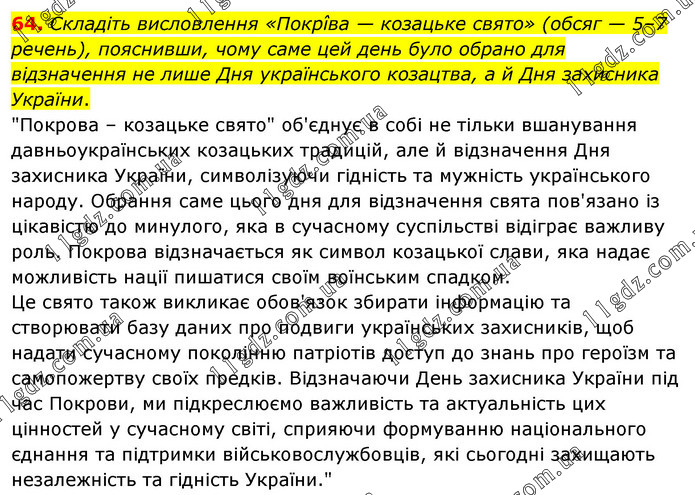 Складіть висловлення «Покрîва — козацьке свято» (обсяг — 5–7 речень), пояснивши, чому саме цей день було обрано для відзначення не лише Дня українського козацтва, а й Дня захисника України. "Покрова – козацьке свято" об'єднує в собі не тільки вшанування давньоукраїнських козацьких традицій, але й відзначення Дня захисника України, символізуючи гідність та мужність українського народу. Обрання саме цього дня для відзначення свята пов'язано із цікавістю до минулого, яка в сучасному суспільстві відіграє важливу роль. Покрова відзначається як символ козацької слави, яка надає можливість нації пишатися своїм воїнським спадком. Це свято також викликає обов'язок збирати інформацію та створювати базу даних про подвиги українських захисників, щоб надати сучасному поколінню патріотів доступ до знань про героїзм та самопожертву своїх предків. Відзначаючи День захисника України під час Покрови, ми підкреслюємо важливість та актуальність цих цінностей у сучасному світі, сприяючи формуванню національного єднання та підтримки військовослужбовців, які сьогодні захищають незалежність та гідність України."