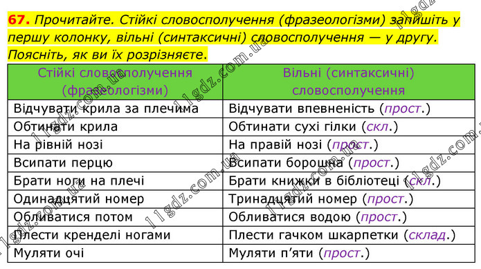 Прочитайте. Стійкі словосполучення (фразеологізми) запишіть у першу колонку, вільні (синтаксичні) словосполучення — у другу. Поясніть, як ви їх розрізняєте. Стійкі словосполучення (фразеологізми) Вільні (синтаксичні) словосполучення Відчувати крила за плечима Відчувати впевненість (прост.) Обтинати крила Обтинати сухі гілки (скл.) На рівній нозі На правій нозі (прост.) Всипати перцю Всипати борошна (прост.) Брати ноги на плечі Брати книжки в бібліотеці (скл.) Одинадцятий номер Тринадцятий номер (прост.) Обливатися потом Обливатися водою (прост.) Плести кренделі ногами Плести гачком шкарпетки (склад.) Муляти очі Муляти п’яти (прост.)