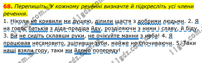 Перепишіть. У кожному реченні визначте й підкресліть усі члени речення. 1. Ніколи не кривили ми душею, ділили щастя з добрими людьми. 2. Я на голос батьків з діда-прадіда йду, розділяючи з ними і славу, й біду. 3. Ви не сидіть склавши руки, не очікуйте манни з неба! 4. Я працював несамовито, зціпивши зуби, майже не спочиваючи. 5. Таки наші взяли гору, таки ми йдемо попереду!