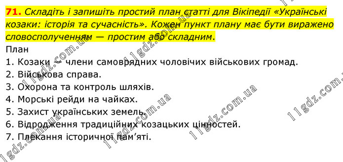 Складіть і запишіть простий план статті для Вікіпедії «Українські козаки: історія та сучасність». Кожен пункт плану має бути виражено словосполученням — простим або складним. План 1. Козаки — члени самоврядних чоловічих військових громад. 2. Військова справа. 3. Охорона та контроль шляхів. 4. Морські рейди на чайках. 5. Захист українських земель. 6. Відродження традиційних козацьких цінностей. 7. Плекання історичної пам’яті.