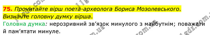Прочитайте вірш поета-археолога Бориса Мозолевського. Визначте головну думку вірша. Головна думка: нерозривний зв’язок минулого з майбутнім; поважати й пам’ятати минуле.