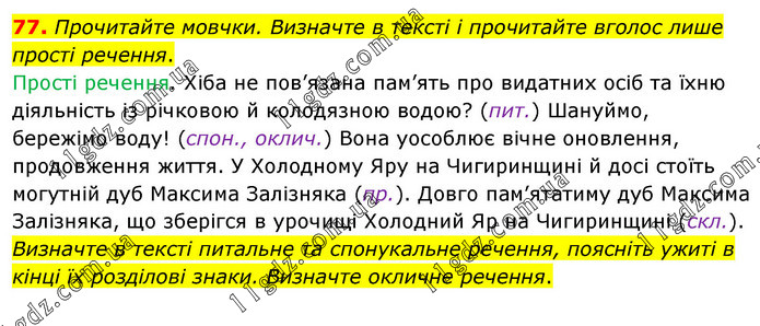 Прочитайте мовчки. Визначте в тексті і прочитайте вголос лише прості речення. Прості речення. Хіба не пов’язана пам’ять про видатних осіб та їхню діяльність із річковою й колодязною водою? (пит.) Шануймо, бережімо воду! (спон., оклич.) Вона уособлює вічне оновлення, продовження життя. У Холодному Яру на Чигиринщині й досі стоїть могутній дуб Максима Залізняка (пр.). Довго пам’ятатиму дуб Максима Залізняка, що зберігся в урочищі Холодний Яр на Чигиринщині (скл.). Визначте в тексті питальне та спонукальне речення, поясніть ужиті в кінці їх розділові знаки. Визначте окличне речення.