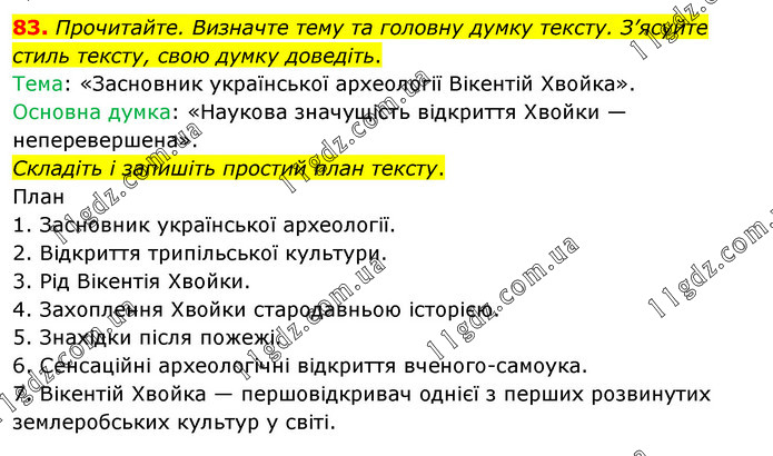 Прочитайте. Визначте тему та головну думку тексту. З’ясуйте стиль тексту, свою думку доведіть. Тема: «Засновник української археології Вікентій Хвойка». Основна думка: «Наукова значущість відкриття Хвойки — неперевершена». Складіть і запишіть простий план тексту. План 1. Засновник української археології. 2. Відкриття трипільської культури. 3. Рід Вікентія Хвойки. 4. Захоплення Хвойки стародавньою історією. 5. Знахідки після пожежі. 6. Сенсаційні археологічні відкриття вченого-самоука. 7. Вікентій Хвойка — першовідкривач однієї з перших розвинутих землеробських культур у світі.