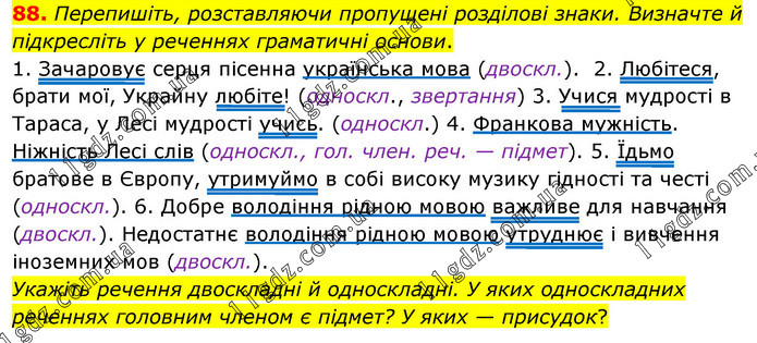 Перепишіть, розставляючи пропущені розділові знаки. Визначте й підкресліть у реченнях граматичні основи. 1. Зачаровує серця пісенна українська мова (двоскл.). 2. Любітеся, брати мої, Украйну любіте! (односкл., звертання) 3. Учися мудрості в Тараса, у Лесі мудрості учись. (односкл.) 4. Франкова мужність. Ніжність Лесі слів (односкл., гол. член. реч. — підмет). 5. Їдьмо братове в Європу, утримуймо в собі високу музику гідності та честі (односкл.). 6. Добре володіння рідною мовою важливе для навчання (двоскл.). Недостатнє володіння рідною мовою утруднює і вивчення іноземних мов (двоскл.). Укажіть речення двоскладні й односкладні. У яких односкладних реченнях головним членом є підмет? У яких — присудок?