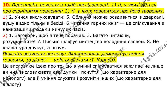 Перепишіть речення в такій послідовності: 1) ті, у яких ідеться про сприйняття мовлення; 2) ті, у яких говориться про його творення. 1) 2. Учися вислуховувати! 5. Обличчя можна роздивитися в дзеркалі, душу видно тільки в бесіді. 6.Читання гарних книг — це спілкування з найкращими людьми минулих часів. 2) 1. Заговори, щоб я тебе побачив. 3. Багато читаючи, розумнішайте! 7. Письмо шліфує мистецтво володіння словом. 8. Не клавіатура друкує, а розум. Поясніть значення вислову: Якщо монолог демонструє вміння говорити, то діалог — уміння слухати (І. Карпов). Це висловлює ідею про те, що в умінні спілкуватися важливе не лише вміння висловлювати свої думки і почуття (що характерно для монологу) але й уміння слухати і розуміти інших (що характерно для діалогу).
