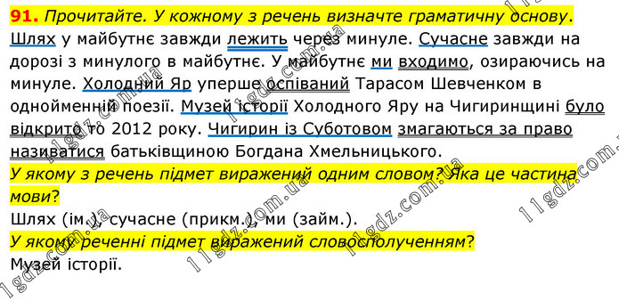 Прочитайте. У кожному з речень визначте граматичну основу. Шлях у майбутнє завжди лежить через минуле. Сучасне завжди на дорозі з минулого в майбутнє. У майбутнє ми входимо, озираючись на минуле. Холодний Яр уперше оспіваний Тарасом Шевченком в однойменній поезії. Музей історії Холодного Яру на Чигиринщині було відкрито то 2012 року. Чигирин із Суботовом змагаються за право називатися батьківщиною Богдана Хмельницького. У якому з речень підмет виражений одним словом? Яка це частина мови? Шлях (ім.), сучасне (прикм.), ми (займ.). У якому реченні підмет виражений словосполученням? Музей історії.