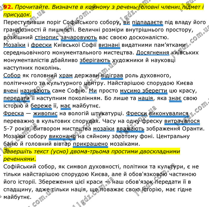 Прочитайте. Визначте в кожному з речень головні члени: підмет і присудок. Переступивши поріг Софійського собору, ви підпадаєте під владу його грандіозності й пишності. Величні розміри внутрішнього простору, розкішний стінопис зачаровують вас своєю досконалістю. Мозаїки і фрески Київської Софії визнані видатними пам’ятками середньовічного монументального мистецтва. Досягнення київських монументалістів дбайливо зберігають художники й науковці наступних поколінь. Собор як головний храм держави відіграв роль духовного, політичного та культурного центру. Найстарішою спорудою Києва вчені називають саме Софію. Ми просто мусимо зберегти цю красу, передати її наступним поколінням. Бо лише та нація, яка знає свою історію й береже її, має майбутнє. Фреска — живопис на вологій штукатурці. Фрески виконувалися переважно в культових спорудах. Часу на одну фреску витрачалося 5-7 років. Витвором мистецтва мозаїки вважають зображення Оранти. Мозаїки собору виконано на сяйному золотому фоні. Центральну баню й головний вівтар прикрашено мозаїками. Завершіть текст (усно) двома-трьома простими двоскладними реченнями. Софійський собор, як символ духовності, політики та культури, є не тільки найстарішою спорудою Києва, але й обов'язковою частиною його історії. Збереження цієї краси — наш обов'язок передати її в спадщину, адже тільки нація, що поважає свою історію, має гідне майбутнє.