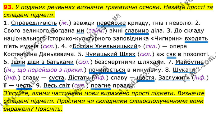 У поданих реченнях визначте граматичні основи. Назвіть прості та складені підмети. 1. Справедливість (ім.) завжди переможе кривду, гнів і неволю. 2. Свого великого Богдана ми (займ.) вічні славимо діла. 3. До складу національного історико-культурного заповідника «Чигирин» входять п’ять музеїв (скл.). 4. «Богдан Хмельницький» (скл.) — опера Костянтина Данькевича. 5. Чумацький Шлях (скл.) аж сяє в позолоті. 6. Ішли діди з батьками (скл.) безсмертними шляхами. 7. Майбутнє (ім., що перейшов з прикм.) починається в минулому. 8. Шукати (інф.) славу — суєта. Дістати (інф.) славу — щастя. Заслужити (інф.) її — честь. 9. Весь світ (скл.) прагне правди. З’ясуйте, якими частинами мови виражено прості підмети. Визначте складені підмети. Простими чи складними словосполученнями вони виражені? Поясніть.