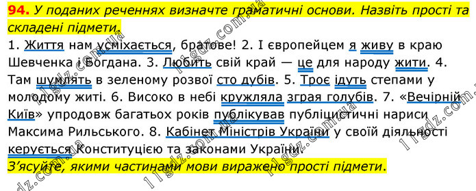 У поданих реченнях визначте граматичні основи. Назвіть прості та складені підмети. 1. Життя нам усміхається, братове! 2. І європейцем я живу в краю Шевченка і Богдана. 3. Любить свій край — це для народу жити. 4. Там шумлять в зеленому розвої сто дубів. 5. Троє ідуть степами у молодому житі. 6. Високо в небі кружляла зграя голубів. 7. «Вечірній Київ» упродовж багатьох років публікував публіцистичні нариси Максима Рильського. 8. Кабінет Міністрів України у своїй діяльності керується Конституцією та законами України. З’ясуйте, якими частинами мови виражено прості підмети.