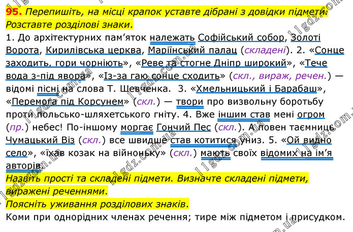 Перепишіть, на місці крапок уставте дібрані з довідки підмети. Розставте розділові знаки. 1. До архітектурних пам’яток належать Софійський собор, Золоті Ворота, Кирилівська церква, Маріїнський палац (складені). 2. «Сонце заходить, гори чорніють», «Реве та стогне Дніпр широкий», «Тече вода з-під явора», «Із-за гаю сонце сходить» (скл., вираж, речен.) — відомі пісні на слова Т. Шевченка. 3. «Хмельницький і Барабаш», «Перемога під Корсунем» (скл.) — твори про визвольну боротьбу проти польсько-шляхетського гніту. 4. Вже іншим став мені огром (пр.) небес! По-іншому моргає Гончий Пес (скл.). А повен таємниць Чумацький Віз (скл.) все швидше став котитися униз. 5. «Ой видно село», «їхав козак на війноньку» (скл.) мають своїх відомих на ім’я авторів. Назвіть прості та складені підмети. Визначте складені підмети, виражені реченнями. Поясніть уживання розділових знаків. Коми при однорідних членах речення; тире між підметом і присудком.
